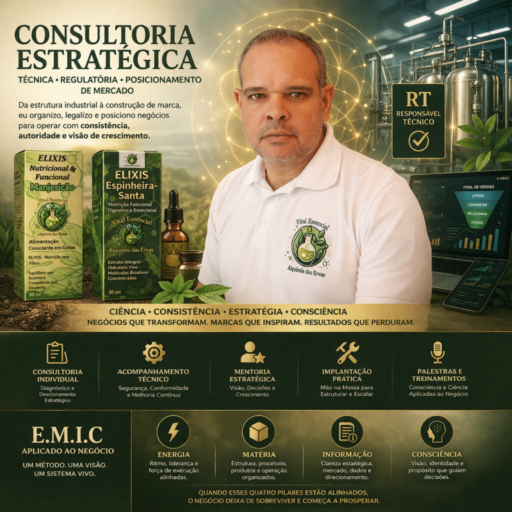 Quando aplico o E.M.I.C ao negócio, eu não olho apenas para um setor isolado. Eu observo a empresa como um ecossistema. Avalio a energia da liderança e da operação, organizo a matéria através da estrutura técnica e regulatória, corrijo a informação com estratégia e direcionamento, e fortaleço a consciência empresarial para que o crescimento deixe de ser apenas desejo e passe a se tornar construção real. É isso que torna minha consultoria diferente: eu não entrego apenas ajustes técnicos, eu ajudo a alinhar o negócio por inteiro.